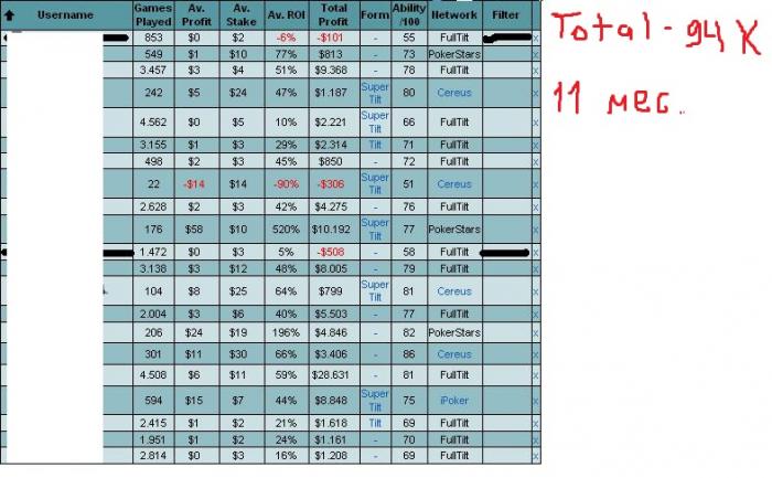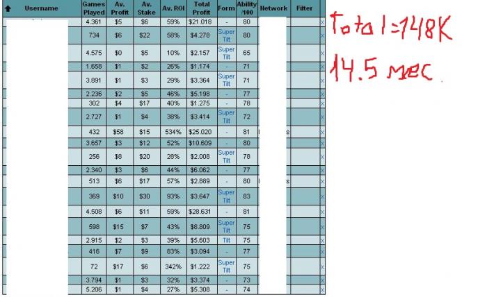 Вставил графики. 1) Общий график. 2) График только турниров от 180 чел. и больше 3) Статистика Шаркскопа общая и по турнирам от 180 и больше 4) От 30 до 90 чел., в основном это сателиты-ребайники и от 90 до 180 это многостоловые СНГ. Нужно учесть, что 2-3К профита в некоторых никах пренадлежит не мне. В графиках не учтены нокауты, рейкбек, дележка, бонусы и пара ников с малых румов, если учесть, то профит думаю будет чуть больше 60К.