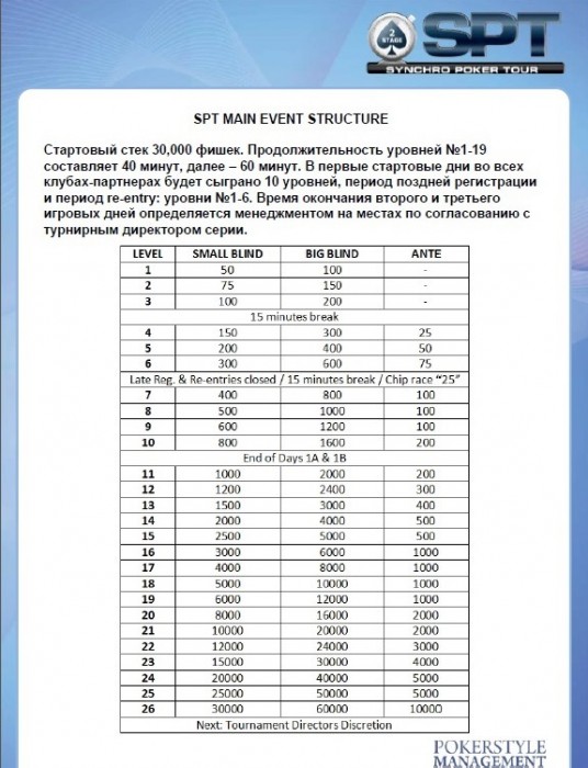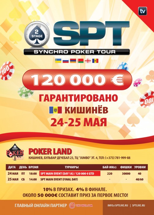 Онлайн этап Synchro Poker Tour пройдет 23 мая в 19:00, московское время.ВНИМАНИЕ! Принять участие в онлайн этапе смогут все желающие, а не только грузины. В онлайн этапе будет действовать та же схема, 10% от количества участников в призах- 4% попадают в финальную часть. Валюта покерного рума – грузинские лари. Курс валюты 1$= 1,6 лари, 1€= 2,2 лари.