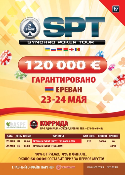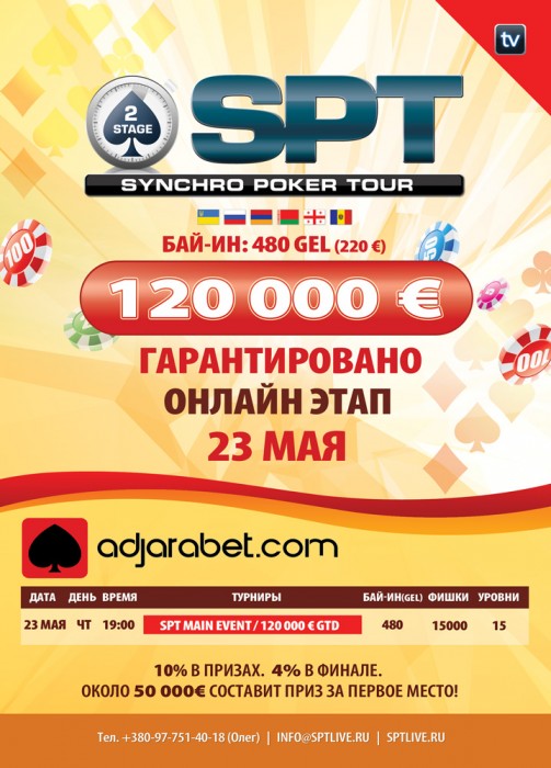 Онлайн этап Synchro Poker Tour пройдет 23 мая в 19:00 , московское время.ВНИМАНИЕ! Принять участие в онлайн этапе смогут все желающие, а не только грузины.