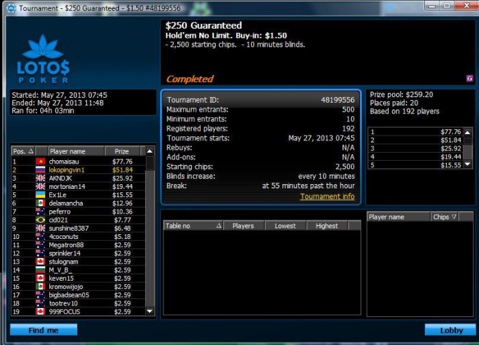 Итак, в первый день дневника отыграл 43 турнира, в минус 100$. Минус вызван тем что в него входит Скупчик (-27) ну и было пару обидных вылетов на предфиналках и