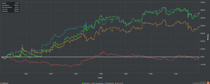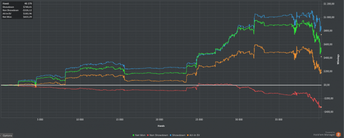 И да. По графику видно что последние руки просто кошмар, отвечу тут. Это были руки в адском псих.состоянии были, случилось много неприятного в реале, а два одновременных переезда на двух столах просто ввели меня в аффективное состояние так скажем, нарушил главное правило не запускать клиент когда что т вокруг не нормально. После этого и перестал играть в онлайне.