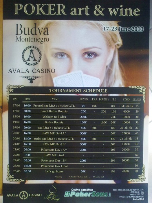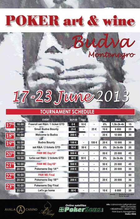 С 17 по 23 июня в черногорском городе Будва в казино Авала пройдет фестиваль Poker Art and Wine при поддержки онлайн покер рума PokerSens. Здесь Вы сможете найти турниры на любой интересующий вас вкус: от фрироллов до главного события со вступительным бай-ином €500, стартовые дни которого пройдут 20-го и 21-го июня.