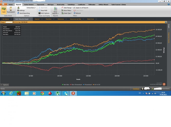 Результат, конечно, не ахти какой, но нужно учесть, что это игра с самого начала с ошибками и их исправлением, с преодолением психологических барьеров, с замазками и т.д. Думаю сейчас я могу бить лимит НЛ 25 с винрейтом 8-10 бб/100, нл50 - 6-7 бб/100