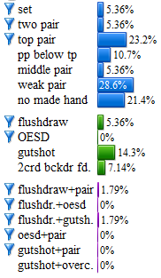 Согласен) Если разбирать по-полочкам, то здесь вобще непростая раздача. Судя по имеющейся информации, можно предположить что МР широко открывает и хиро закрыл по АТ не с целью чекать попав в ТП, тоесть МР открывает ~AA-22,AKo-A9o,KQo-KTo,QJo-QTo,JTo,AKs-A2s,KQs-K8s,QJs-Q9s,JTs-J9s,T9s,98s,87s,76s,65s,54s,43s,32s для плюсового колла, может шире. Попав в нескоординированный А-хай борд с флешдро опп ставит цбет, думаю он часто поставит цбет и будет чекать на терне и ривере без усилений, тоесть часто он не попадет и будет просто ставить цбет. В то время как хиро с ~AA-22,AKo-ATo,KQo,AKs-A9s,KQs-KTs,QJs,JTs,T9s,98s,87s,76s,65s,54s попадет В принципе нам выгодно коллировать с шдвелью, все зависит от цбета на флопе и агрессии на последующих улицах. Я бы в любом случае давал бы тут рейз, а не колл, даже с низким шдвелью, тогда мы будем знать где мы стоим+ можем просто дочекать и забрать пот+ дрова нам оплатят+ будем забирать много банков уже на флопе.