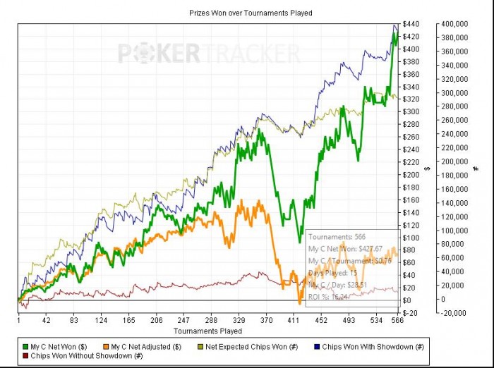 С 300 турниров начал катать 7$ sng, 6 и 9 макс. Онли не турбовые. По графику у меня дикий перебор показывает, но по игре мне кажется всё более менее нормально. Это нормально для таких турниров или же ждать мощный даун?