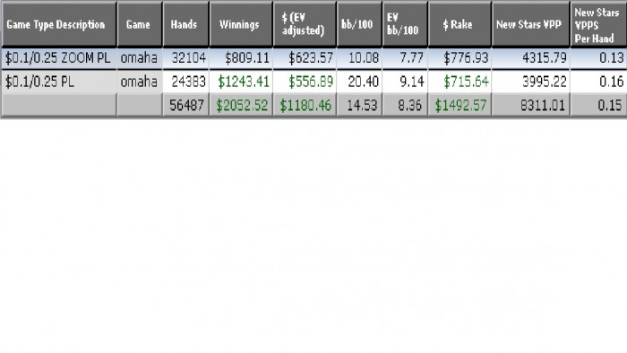 Всем привет. Я Андрей. 26 лет. Живу в г. Брянске. Веду блог на стратеджи, но там сейчас в разделе омаха очень глухо, поэтому решил переехать сюда. С покером познакомился в начале 2011 г., в конце 2012 г. начал уделять много времени теории и гринду, ибо работать за 700$ как то не очень хотелось. Изначально я играл МТСНГ турбо 45, 90 макс. Играл довольно успешно, но в планах было научиться бить омаху. Вначале 2013 начал катать зум пл10, где в тильте залил почти весь БР. После чего желание катать омаху пропало на некоторое время. Потом катал фифти50 турбо, тоже довольно успешно, но перспективы я в них не видел, ибо уже на 7м лимите сидела куча неплохих регов. И вот в марте я взялся серьезно за омаху, начал с пл5. За месяц побил пл5 и пл10. Ну и наконец то я перестал сильно тильтовать.