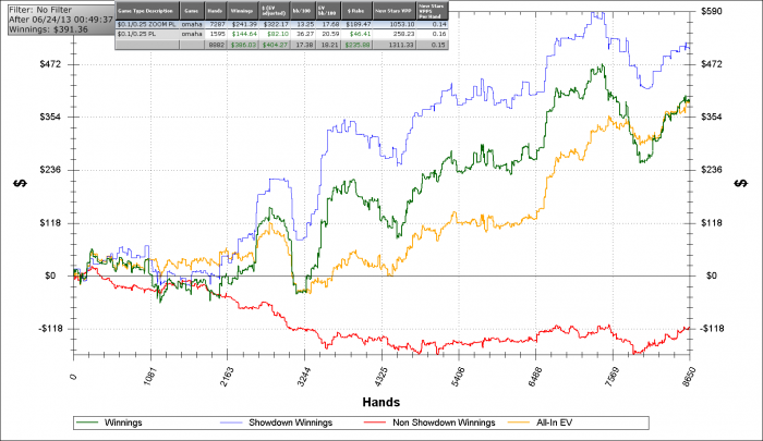 Изначально я играл МТСНГ турбо 45, 90 макс. Играл довольно успешно, но в планах было научиться бить омаху. Вначале 2013 начал катать зум пл10, где в тильте залил почти весь БР. После чего желание катать омаху пропало на некоторое время. Потом катал фифти50 турбо, тоже довольно успешно, но перспективы я в них не видел, ибо уже на 7м лимите сидела куча неплохих регов.