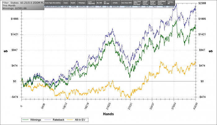 В кассе оставалось 300 баксов, и я вернулся обратно в фифтики, чтобы набить 1.2-1.5к и дальше покорять омаху. К концу мая у меня уже было в кассе 1.2к и я начал делать осторожные вылазки на пл25. Однажды во время сессии открыл чисто полудить биг за 11 и еще пару дешевых МТТ. Задипранил в биге, но вылетел в топ 50. Ну и на следующий день решил сыграть полную сессию дешевых МТТ(за всё время было сыграно около 500, но доездов не было) ну и тут понеслось за неделю катки было много финалок и хороших призов. Май получился очень удачным.