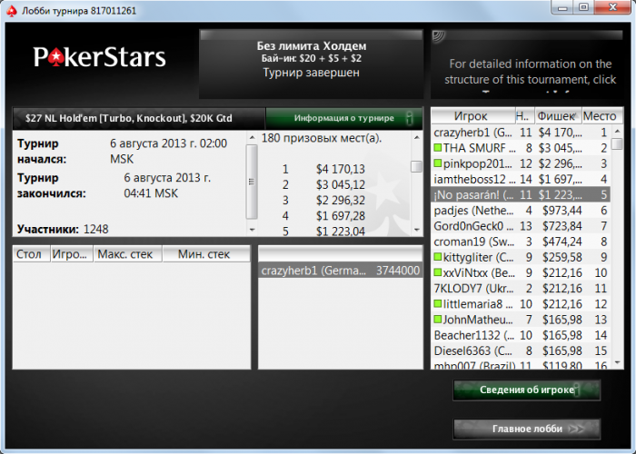 ТОП-1 $16.50 NL Holdem [Turbo], 20K Gtd