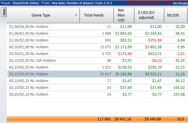 С покером знаком более 3х лет,более-менее серьезно занимаюсь около года. Рабочий лимит сейчас NL100-200 HU. Когда игры нет, играю 3/6-max.