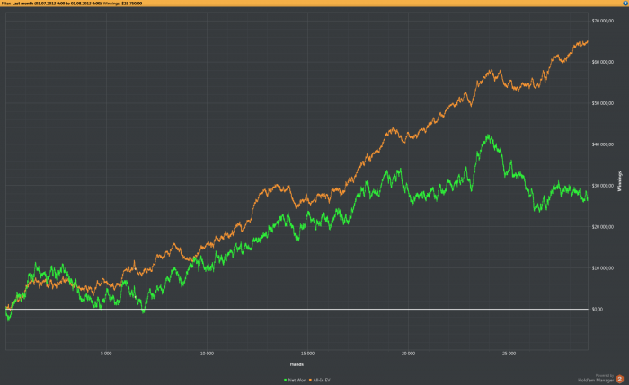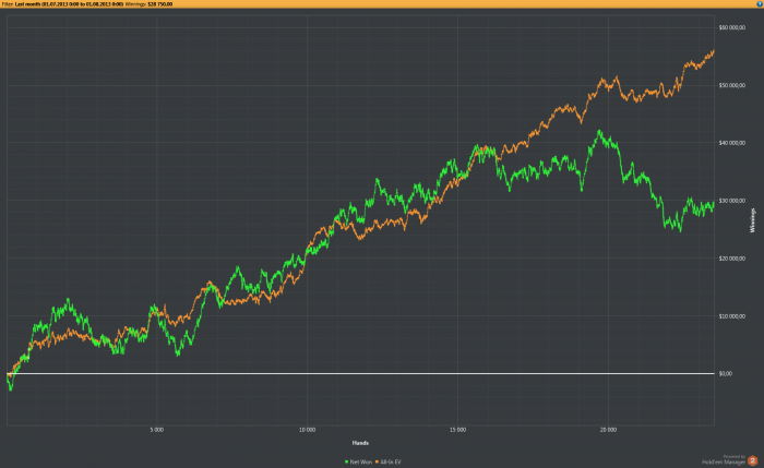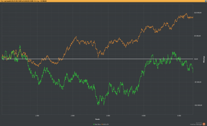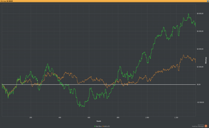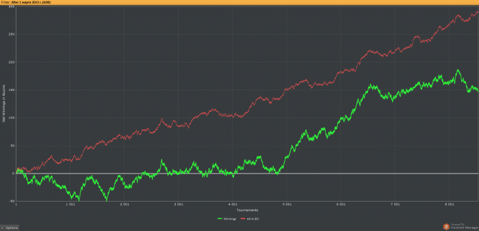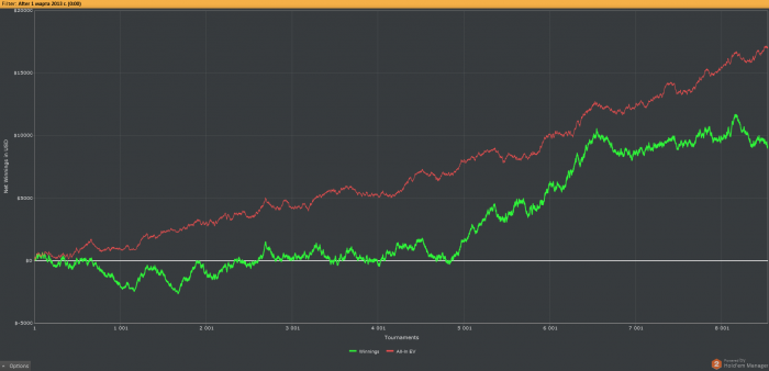 На данный момент (после последней корректировки) за 4500 турниров ев рои 4% (на 60$ - 4.4%). Дистанция достаточно не большая но по ощущениям сдают мне ни чуть не лучше чем сдавали до этого. Поэтому кажется что данные показатели похожи на правду.