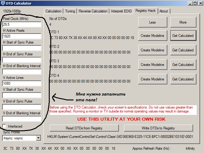 Запустив её- мне кажется, что надо ориентироваться на послед 8 цифр в графе "Modeline" Поэкспериментируй, начинай с послед. комбинации, но так чтобы цифры на твоем скрине совпадали с цифрами в программе.