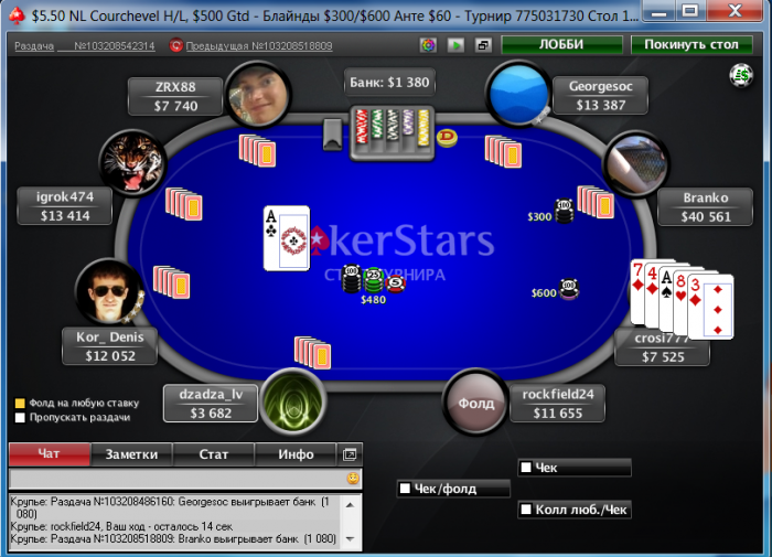 Не знаю, читает это кто-то или нет, но писать буду для себя. Позже буду перечитывать, наверно:) Скрины с верхнего турнира. В режиме онлайн. Справа от меня сидит игрок Branko, который удвоил меня на баббле. Он разыгрывал неприлично много рук, что позволило мне поймать его с моим фулл-хаусом на терне против его флеш-дро. Сейчас он вылетел, подарив остатки стэка парню ZRX88, который висел на волоске пару раздач назад. Игрок Branko типичный мудак. Каким-то образом он накопил стек 40к и был в топ-3. Беты, рейзы, рирейзы. В итоге он на 18 позиции и 10.06 призовых. Хотя стэк был для финального стола, ну или около того.
