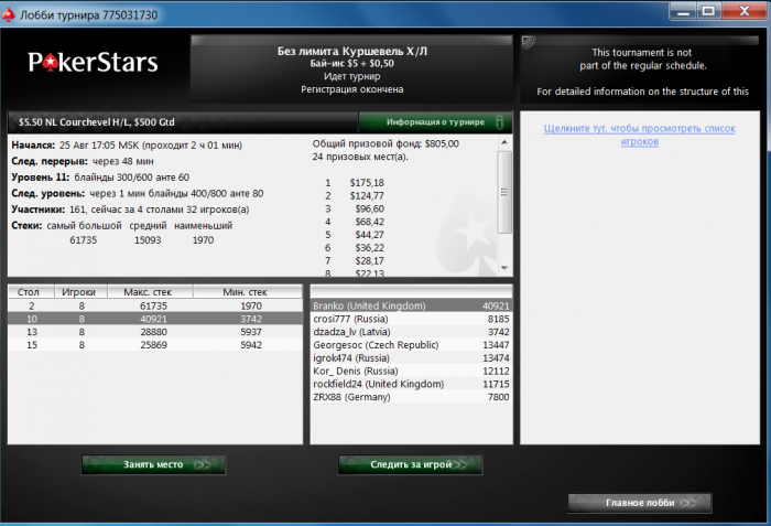 Важно: Начинать Куршевели лучше в начале регистрации. Раньше я регистрировался к минуте 40. В позднюю. К этому моменту вылетает треть игроков на текущий момент турнира. И это, как правило, слабая часть игроков. И я тут подумал, почему бы не попробовать забирать стеки этих ребят? Турнир достаточно новый, для многих он не профильный. Посмотрим, что из этого выйдет. P.S.: до старта 3 дня.