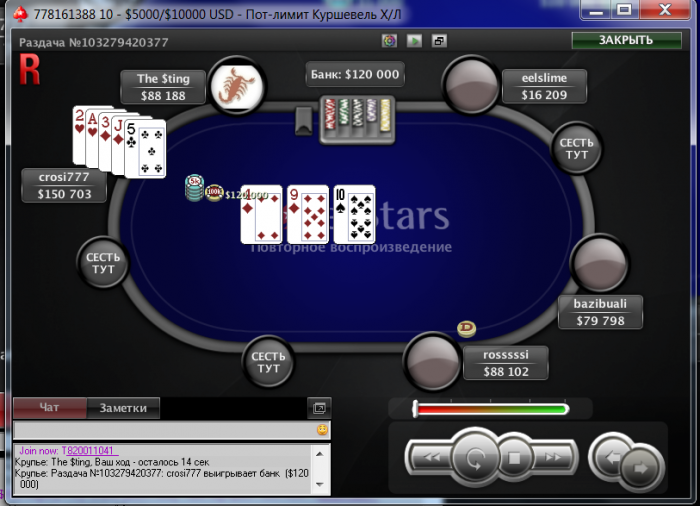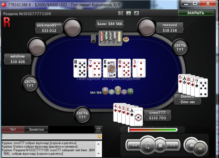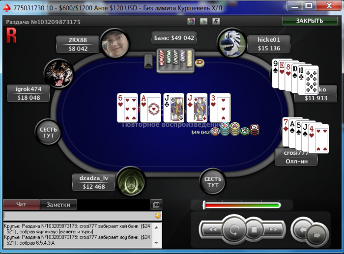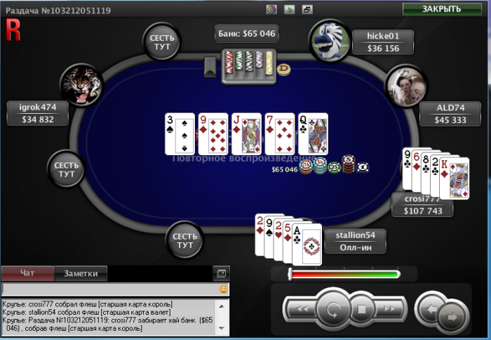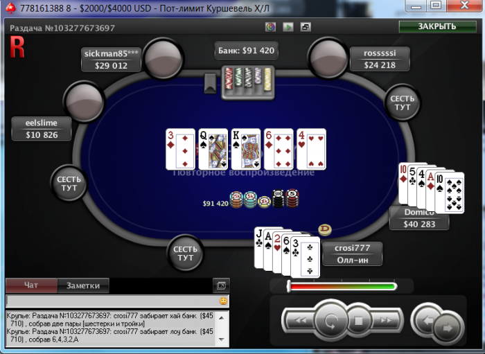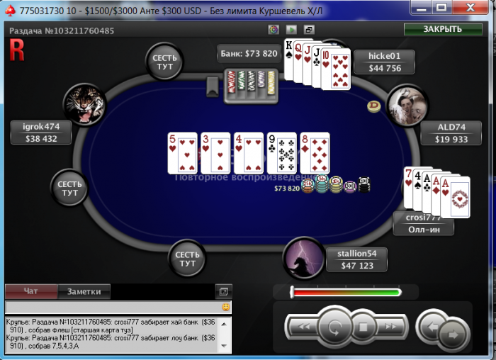 Качели. Качели. Качели. Сперва этот хитрый немец перекупил мой стрит флешем и поделили 75 на 25 в его пользу, потом уже мой флеш не дал ему никакого шанса.