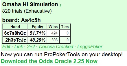 вчера играл офф омаху, вы ставился по доске А45 на 678Д против стрита,на терне сразу доехало. Кореш мой говорит вот переехал человека ,я говорю всмысле? я сильнее был, вобщем примазали по 50 баксов пошли смотреть на покерлистингс, договорились вбить в калькулятор голый стрит без потенциальных раннер флешей и 678 такое же, когда подошли к компу он сказал мне *скинешь мне на старзы*, после проверенного спора я сказал *да не, давай налом*)