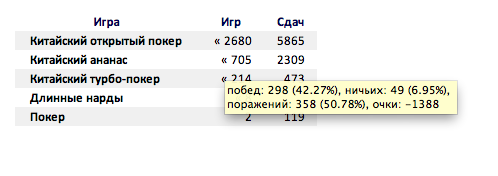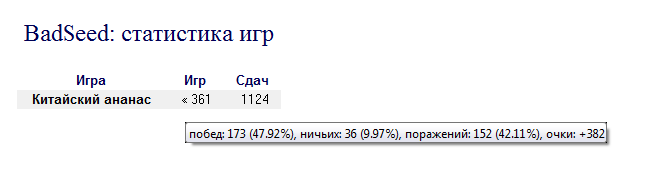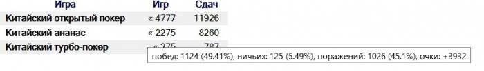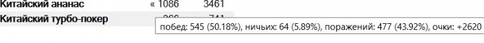 Глянул свою: 1179 игр, 576 побед, 75 ничьих, 528 поражений. +2103 куша. Играю "фо фан" (с) Администрация, так что с учетом рэйка в минусе, ясен пень.