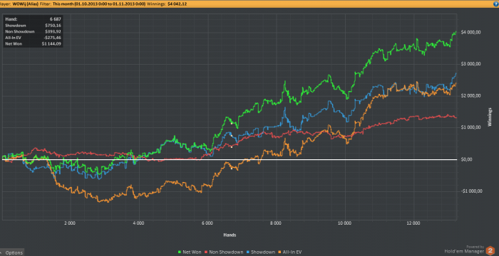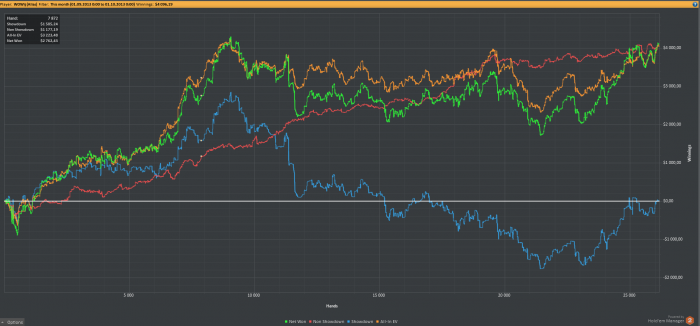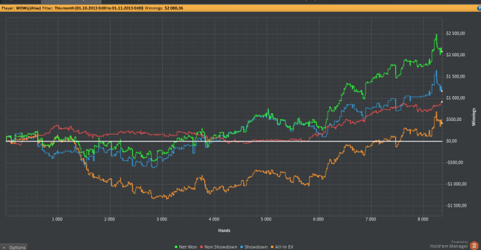 Все друзья, которые тоже зарабатывают на жизнь покером играют другие дисциплины (гипер-турбо снг, омаха-кэш, оффлайн кэш), потому так вышло что в кэше я "самоучка". Прочитал несколько книг, посмотрел за все время штук 20 ВОДов, но я привык всегда все делать по-своему и возможно из-за этого мой подъем был очень медленным, каждый следующий лимит был в основном за счет бонусов и рейкбека. Набил кучу шишек, в результате получился достаточно необычный стиль игры (что-то типа "агрессивный осел с телефоном"), о чем свидетельствуют линии выигрыша на шоудауне и без шоудауна + очень высокий показатель WTSD%.