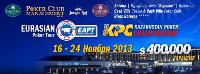Евроазиатский Покерный Тур продолжает свое шествие по континенту! После нашумевшего и яркого дебюта в киевском «Крещатике» организаторы взяли курс на Восток. Уже 16 ноября в самом большом и роскошном казино Центральной Азии Cash Ville Casino & Poker Club развернётся борьба за новые титулы и немалые призовые Eurasian Poker Tour (EAPT) и первого официального Чемпионата Казахстана по покеру Kazakhstan Poker Championship.