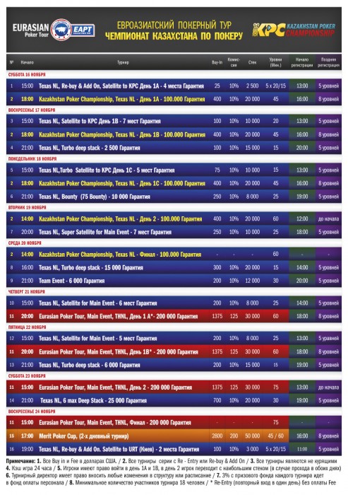 На следующий день после того, как станет известно имя чемпиона Kazakhstan Poker Championship, 21 ноября, начнётся главный турнир серии – Main Event Eurasian Poker Tour со вступительным взносом $1,500 и гарантией $200,000. Участники также смогут отобраться на главный турнир через недорогие сателлиты.