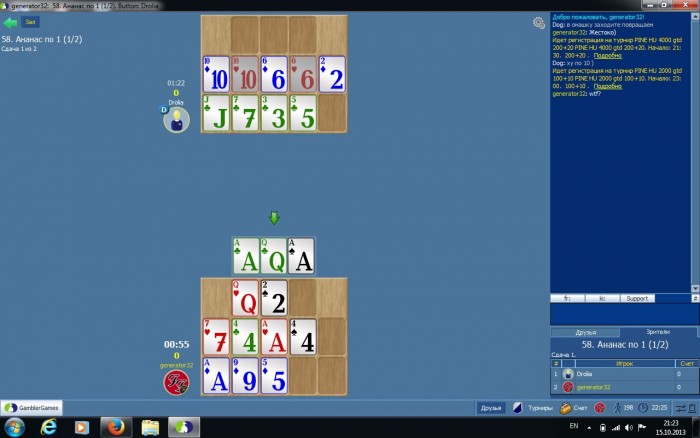 Кстати, спорный вопрос. Если положить вниз четвёрку, учитывая, что неизвестно сколько ещё свободных тузов осталось, к примеру, приходит 10..... и вот она делема. Внизу у нас мелкие карты на пары, вроде как надо, полюбому, десятку класть в середину, но тогда нужен внизу минимум трипс, чтобы положить туза в середину второй парой или еще какую-нибудь пару. А если положить вниз даму, то тянем флеш и спокойно решаем вопрос с серединой. И к тому же, против фантазии лучше флеш иметь внизу, чем две пары, меньше потерь.