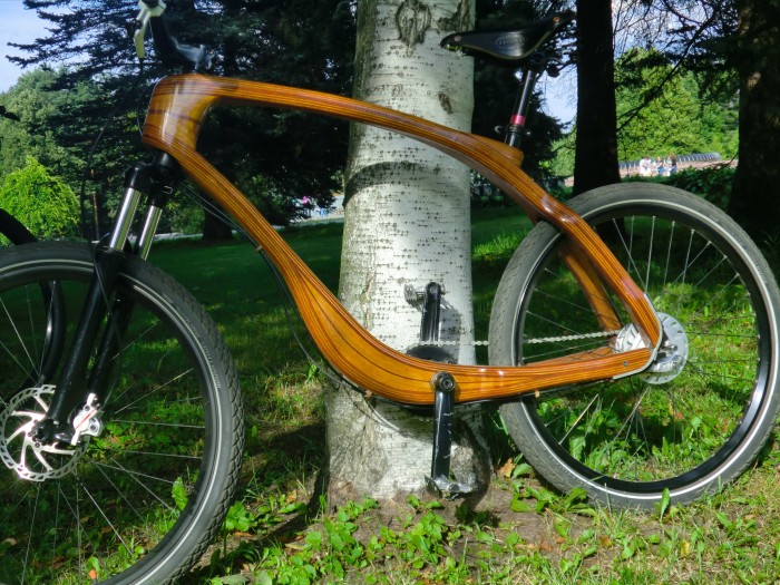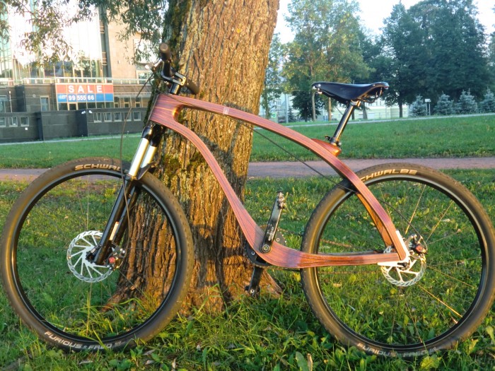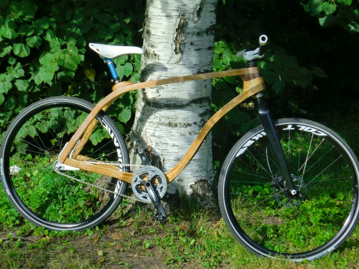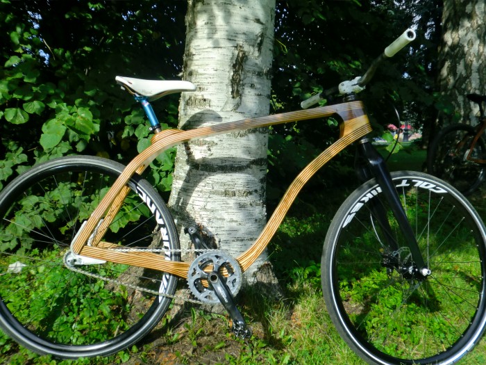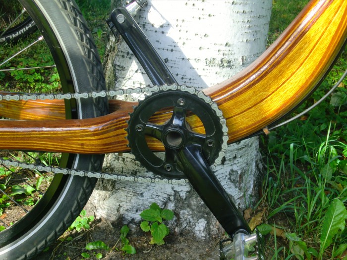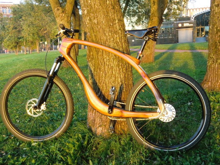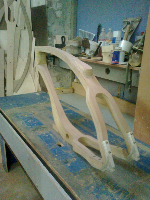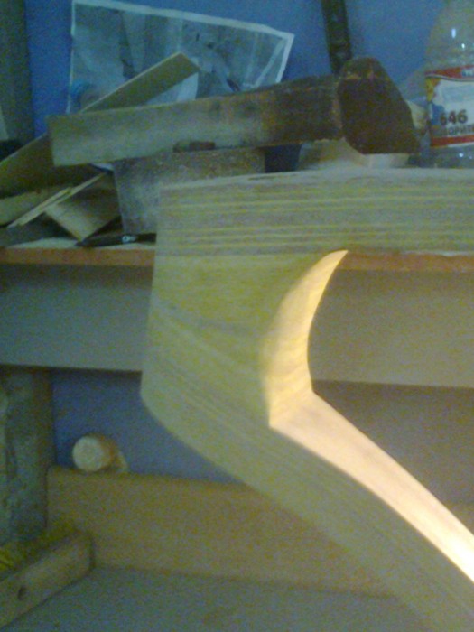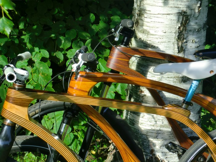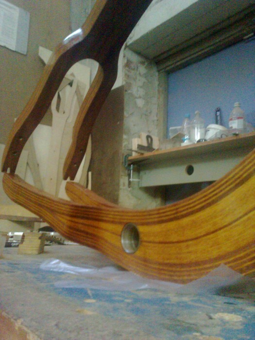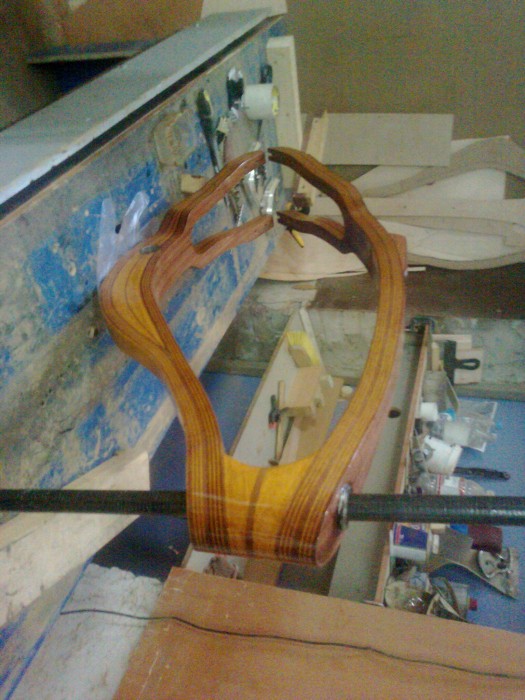 Слои склеиваются между собой эпоксидной смолой. В раму из красного дерева были добавлены прослойки из карбон-кевлара. Так выглядит "полуфабрикат".