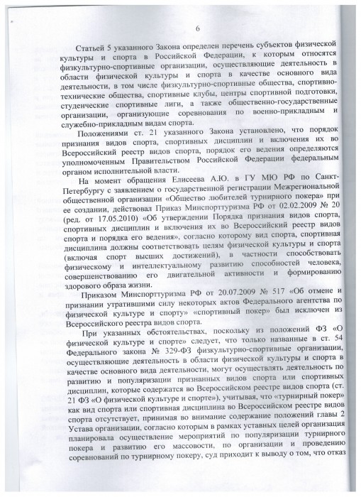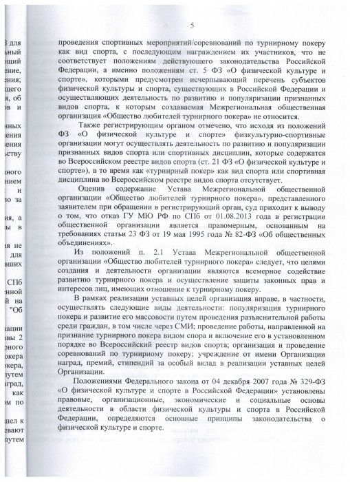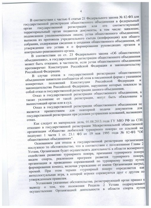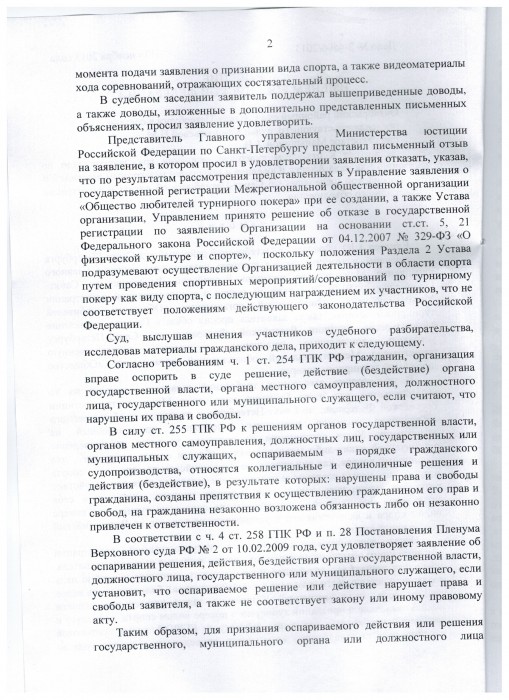 Межрегиональная общественная организация "Общество любителей турнирного покера" не согласилась с решением Министерства юстиции и 21.10.2013 в октябрьский районный суд г. Санкт-Петербурга было подано заявление о признании незаконным решения об отказе в государственной регистрации общественной организации. В просительной части заявитель попросил суд: