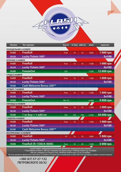 Кэш игра,большое количество регулярных турниров,которые привлекают большое количество игроков из Харькова,Украины...гости из России так же не обходят мимо покерные события,которые происходят в клубе спортивного покера FLASH.