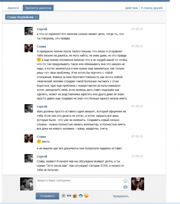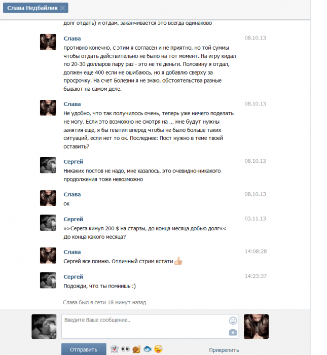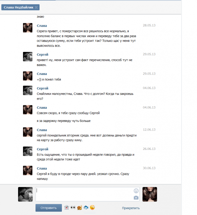 После этого этот пользователь пропал на месяц, на сообщения не отвечал, найдя его в конакте и написав, получил ответ, что долг признает, но денег нет, называл 4-5 дат, когда отдаст обозначенную сумму, все сроки были нарушены.