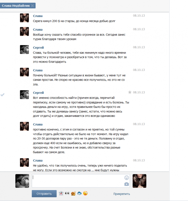 В целом, пользователь выглядит достаточно неуравновешенным человеком, считая, что ничего плохого не совершил и не скрывается, говорит о серьезных проблемах в реальной жизни и о проблемах в жизни вообще, говорит, что я странно себя веду, требуя долг с него, когда он в таком сложном положении. Стоит почитать скриншоты, это достаточно забавно, как человек может сам себе внушить, что делает все верно, "просто не складывается".