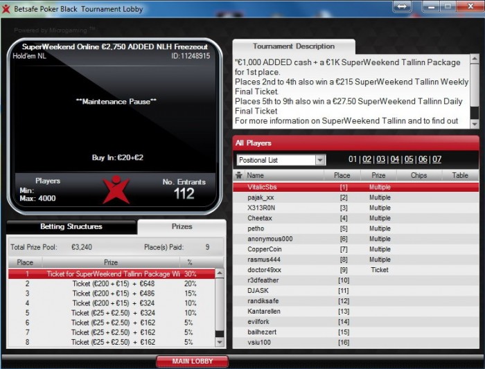 Привет! Выиграл два пакета на SuperWeekend Tallinn Event с 12 по 15 декабря в Эстонии. Пакеты выиграл соответственно здесь http://blog.betsafe.com/poker/TheMicroMasters/ и здесь: