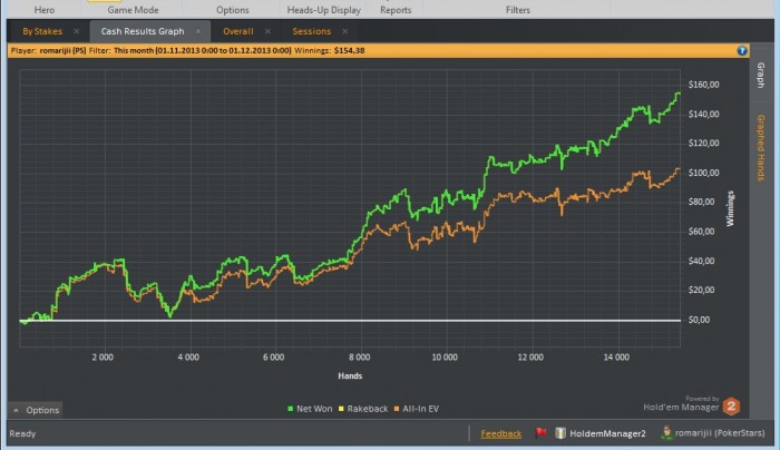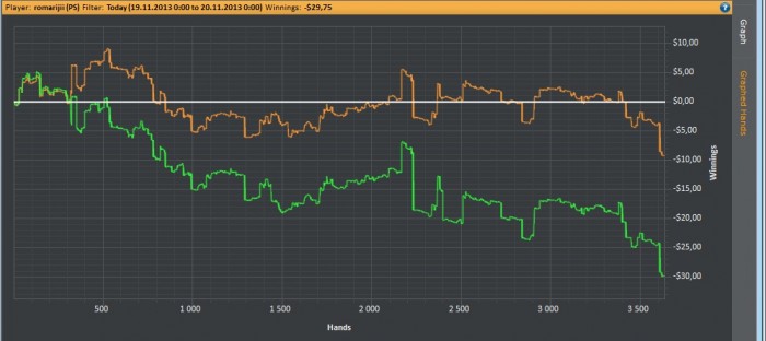 Еще немного о себе. Сейчас катаю нл 5 фр. Делал вылазку на нл 10, том меня приняли с душой и хорошим минусом по ЕВ. Чуть оклемавшись, сейчас набираю форму и скором будущем повторить попытку. Играю не много около 1000-2000 рук в день. Бывают выходные. Играю сейчас только на PS Вот мой график за последний месяц Тут в основном нл 5 Дальше буду выкладывать графики за сессию Милости прошу и открыт для общения