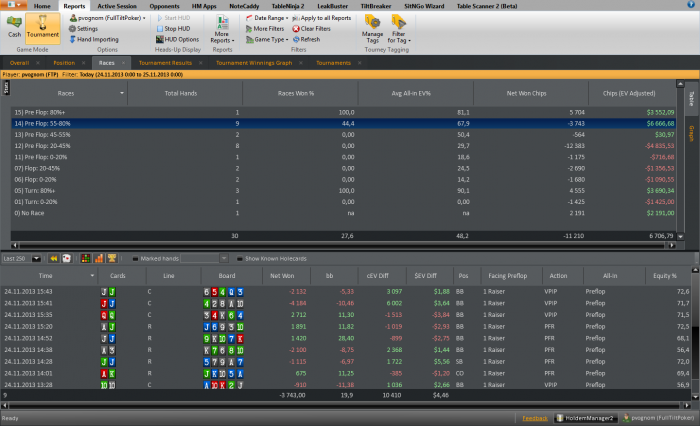 Играю снг 9-макс ФР не турбо с января 2013 года на ФТП, 2,5 месяца играл по 1 $ катая 1 стол фо фан, с РОИ 8,5 перешел на 2,25, там отыграл 1,5 К туриков уже начал по 4 стола гонять с рои 5, банкролл позволил перейти на 5 $, с 1 августа два месяца отыграл 600 турниров с рои 8, уже собирался на десяточки, банкролл был 970$. И тут на тебе за месяц минус 60 БИ за 470 турниров, это совпало с тем, что играть стал меньше, раньше получалось на работе, теперь только дома по 2-3 часа, т.е. по 10-12 турниров в день. Был период - 22 турика без ИТМ, сейчас катаю в около -нулевой зоне, с небольшим минусом. Ухх, как много букв... Так вот, мучает вопрос, сколько это может продолжаться)) И что делать, играть больше, пытаясь преодолеть диспу или сделать перерыв?
