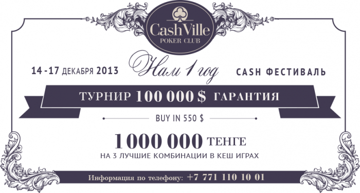 - Специальная акция, приуроченная ко дню рождения клуба CashVille Poker Club - 1.000.000 тенге на 3 лучшие комбинации в кэш-играх фестиваля.