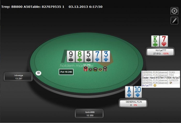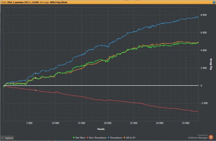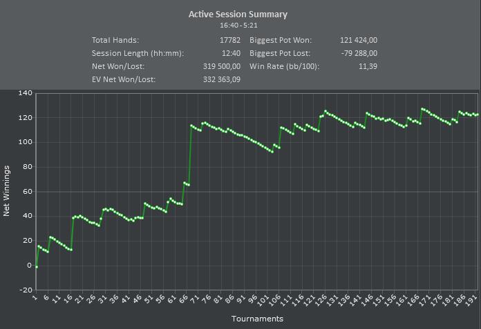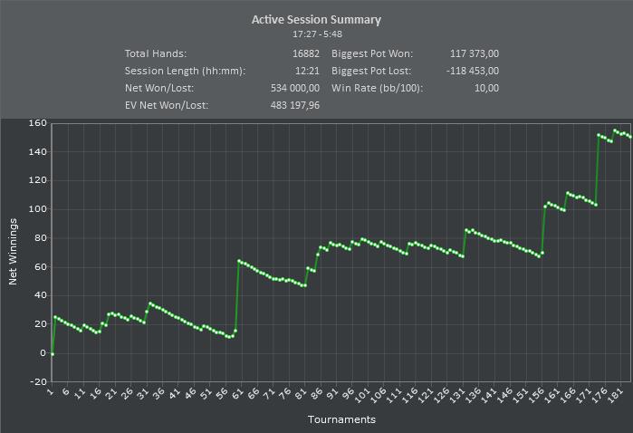 сегодня было много чудовищных ошибок, несколько залитых в тильте перспективных турниров, 2 обрыва инета общей продолжительностью около 10 минут, рывок к магазину за сигами в час ночи при полной загрузке, немного недобора, но мне как-то похуй, плюсуем