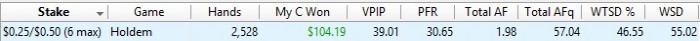 BTN: 30.92 BB (VPIP: 72.73, PFR: 4.55, 3Bet Preflop: 0.00, Hands: 23)