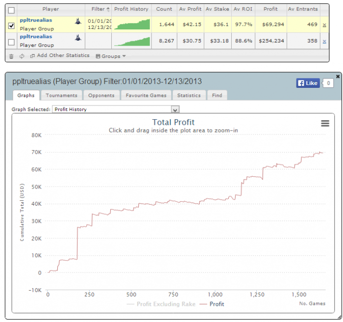 Очень крутой результат, откатал в этом году 14к турниров аби 60 и рой 65% (преимущественно на старзах), так что топ1 п5 заслужен. Что важно с плавным и красивым графиком. Определенно один из лучших мттшников Латвии на данный момент с 200к+ профитом. Статы аллтайм + за 2013: