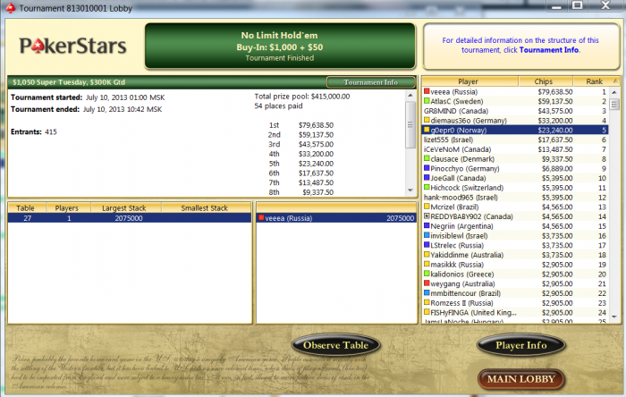 Несколько удручает, что эти заносы и есть основной профит. С другой стороны, настоящие килополяны поляны так и не поддаются. А за этот год отыграл их прилично, пропустил лишь пару воскресений и сыграл все основные турниры в рамках скупов, вкупов, фтопсов и прочего. Как и всем кажется, что не везет в концовках; какие то обидные переезды кулера и прочее. Хотя, вполне вероятно, что просто несколько не правильно строю игру именно в лейтах килополян. Надо как то попровать поменьше дисповых решений на большую часть стека стека принимать. Так же надо как то грамотно вбить себе в голову, что могучие постфлоп блефы, штука в мтт не очень уважаемая. Я это отчетливо понял, когда в одно из воскресений 2 раза был спот, где я превращал руку в блеф на ривере. В итоге после мучительных раздумий получал кол, а фишки все равно ехали ко мне:)