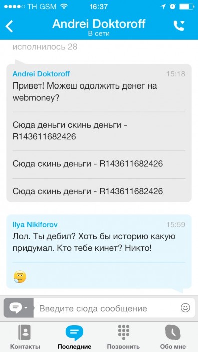 Привет! Можеш одолжить денег на webmoney? [3:19:17 PM] Rodion Longa: неужели и тебя ломанули? :) [3:20:40 PM] Andrei Doktoroff: ? [3:20:41 PM] Andrei Doktoroff: нет [3:20:49 PM] Rodion Longa: видеозвонок7 [3:20:50 PM] Rodion Longa: ? [3:25:23 PM] Andrei Doktoroff: Сюда деньги скинь деньги - R143611682426 [3:25:36 PM] Andrei Doktoroff: Сюда скинь деньги - R143611682426
