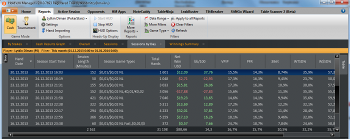 Здравствуйте всем игрокам покерного сообщества. Играю в покер почти 4 года, сначала на фантики, потом во фрироллы, затем кеш и МТТ микролимиты (до $11). Все никак не удавалось поднять свой банкролл (то проигрывал, то выводил) и вот решил с депозита в $50 начать свой путь. Меня больше интересует кеш, так как турниры для меня очень сложное занятие, не хватает терпения. Играю НЛ2 6 макс на 12-16 столах одновременно и вот мои успехи: