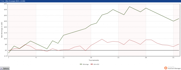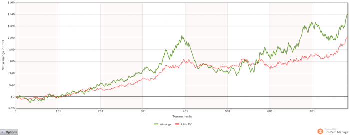 В данный момент играю 8 столов SnG FR Turbo на лимите $1.5, длинна сессии - 4 часа (45-50 турниров), играю преимущественно на выходных. На неделе просто разбираю предыдущую сессию, изучаю статьи, ВОДы. Банкролл-менеджмент у меня такой – столы $3,5 я начну открывать, как только на счету станет больше, чем $500. Хочу выйти на уровень 200 турниров в неделю, но из-за работы и учебы мой предел пока - сотка.