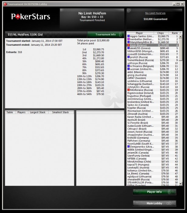 P.s.: Была одна интересная раздача на финальном столе, так и не решили, как правильно было сыграть. Оппонент играл довольно агрессивно всегда префлоп и постфлоп, интересно будет услышать мнения по раздаче и рассуждения