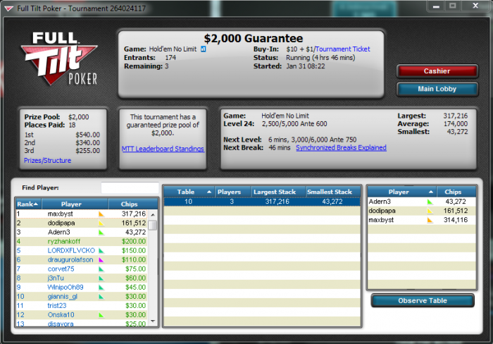 Собралось всего 12 человек, призовой фонд составил примерно 400$ с учетом нескольких реентри, так что назвать турнир полноценным МТТ - было бы не совсем верно! Скорее это "двухстволка SNG 6max" с очень глубокой и плавной структурой! ИТМ - 3 человека с распределением 50/30/20