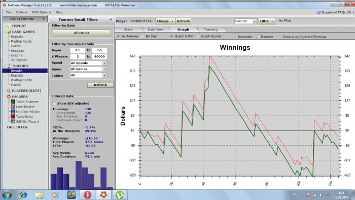 И так марафон закончен! Сыгранно 400 СНГ, вместо 500 по 1 причине - тошнит уже от этого лимита, я его побил, играю от себя, поэтому доигрывать эти 100 турниров посчитал не нужным. Итог марафона - старт минус 9$, финиш плюс 117 + 0,27*(400*0,75)=81. ИТОГО обший плюс 207$
