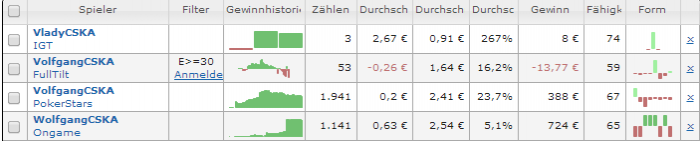 По статистике открыт для поиска в ОФПР и Шаркскоупе. Ники под которыми играл: Pokerstars - VolfgangCSKA Ongame - WolfgangCSKA FullTilt - VolfgangCSKA Главный успех в МТТ - победа в серии Чемпионат РедСтар ( https://www.redstarpoker.ru/promotions/rspchamp ). Мелочь, а приятно)