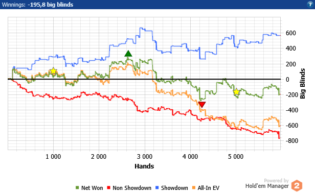 Сыграл в районе 1,5К рук. Примерно в -2 БИ.