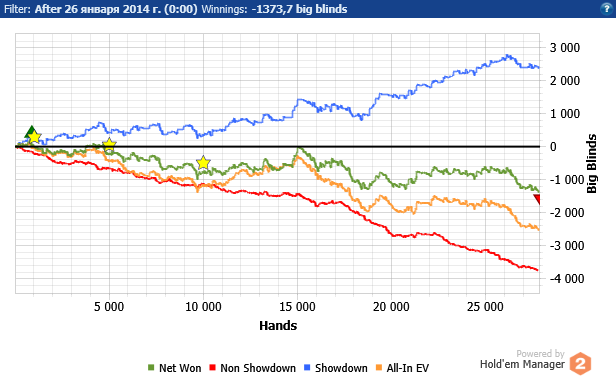 Ну и чисто математическая. В принципе, я думаю, что сыграно минусово, но потом еще обязательно посчитаю. 3бет общий 14, с СО 8,3(60), фолд на 4бет 73.