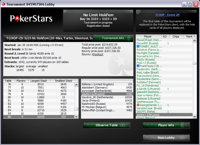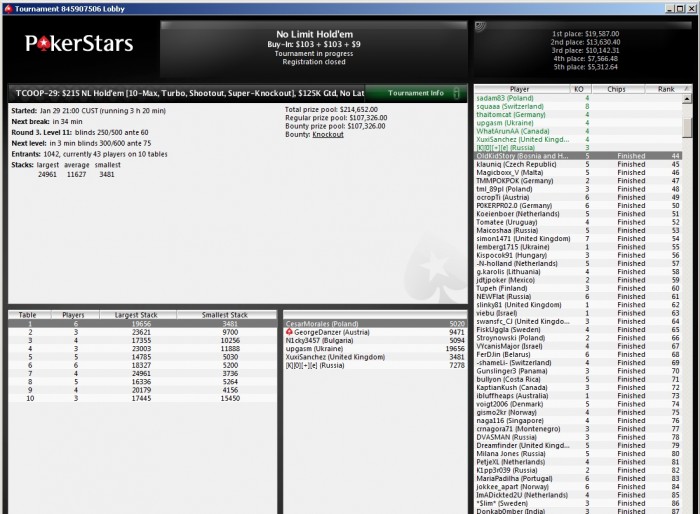 Thank you for participating in TCOOP Event #29, $215 NLHE 10-max Shootout Super-Knockout.