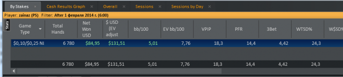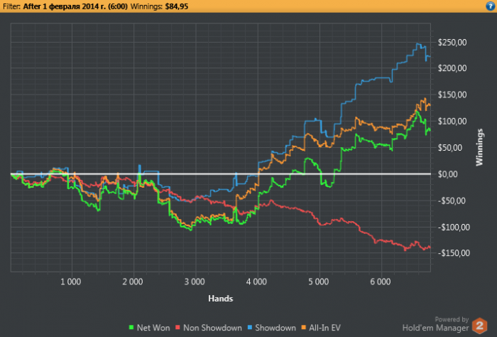 вышли замужженились или под каблуком, на улице холодно, деньги заканчиваются, на nl50 заглянуть хочется, доллар поднимается, украина майдан, олимпиада педики, а я дартаньян.В прошлом году играл nl10 zoom 6макс. Побил его хрен знает каким винрейтом(ну примерно, наверно, может быть, хочется верить 5бб). В январе сего года перешел на nl25 обычные и очень хорошо закрепился. Поскольку недавно купил ssd, график на другом жестком остался. Выложу как нибудь. Так профит где то 1к с рейкберисколькодаютбекем .
