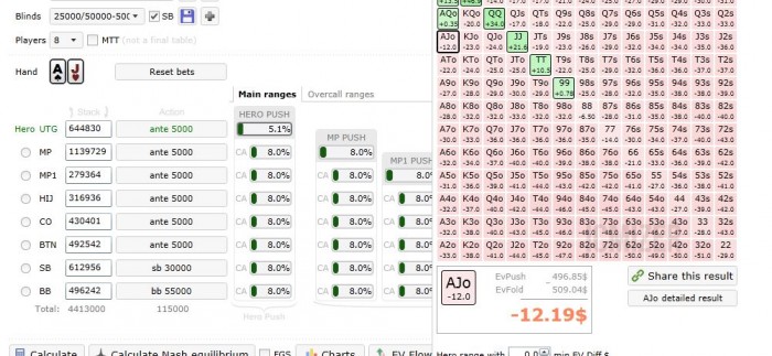 Пушить тут или скидывать AJ - это пограничное решение. Если нужны бабки, или ситуация ближе к первой описанной - то однозначно фолд, думать не надо. Если вторая - то супер-инста пуш, без разговоров.